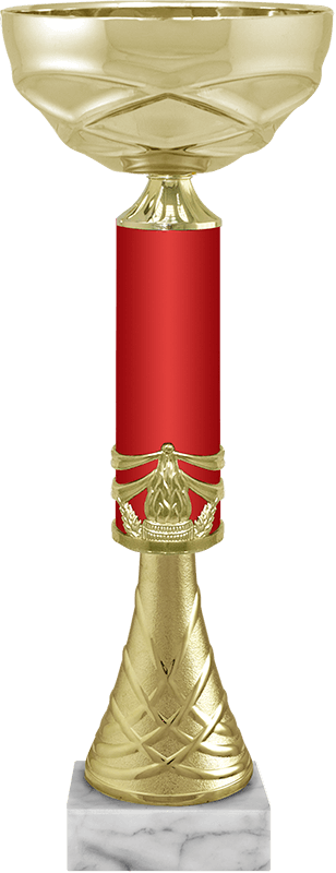 Кубок универсальный. Основной цвет золото, дополнительный красный. Основание натуральный камень белого цвета. Может дополнительно комплектоваться табличкой, заказывается отдельно.