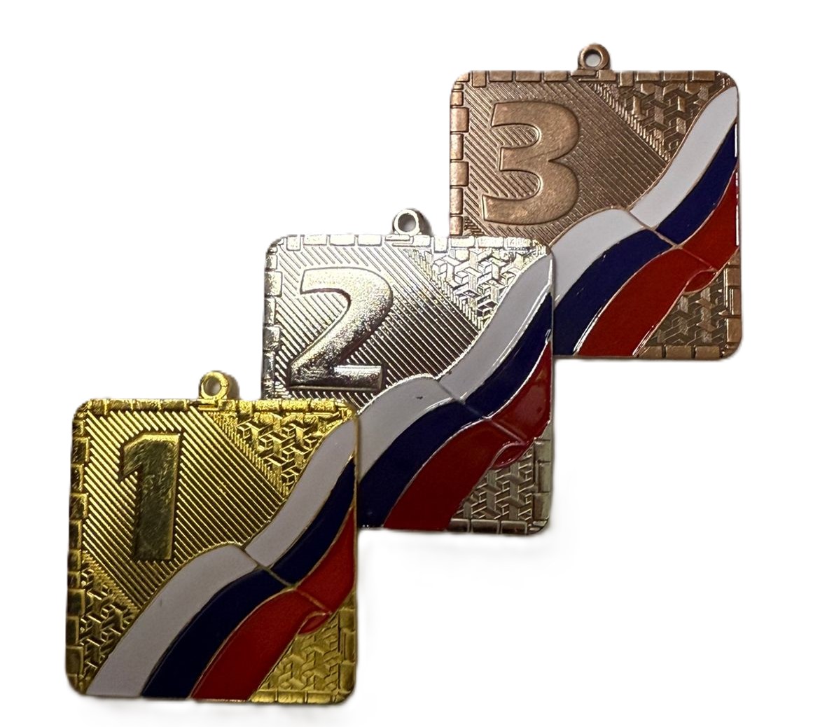 Медаль металлическая. Квадратная 50 мм х 50 мм, толщина 3 мм. Имеет символику флага РФ. может дополнительно комплектоваться лентой и наклейкой (заказывается отдельно)