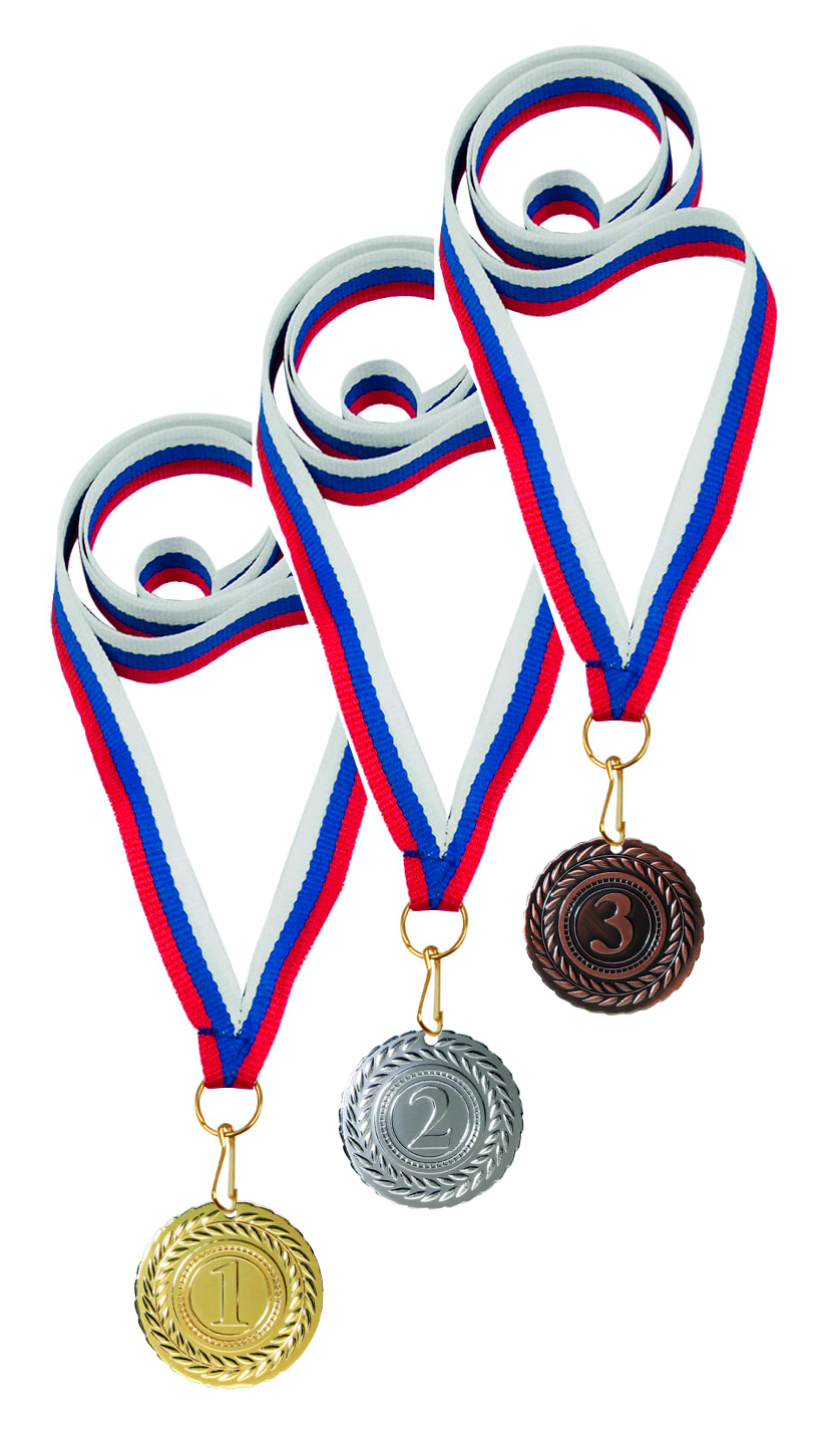 Комплект медалей металлических , диаметр 40 мм, толщина 1,5 мм. В комплект входит три медали 1,2,3 место и три ленты РФ.