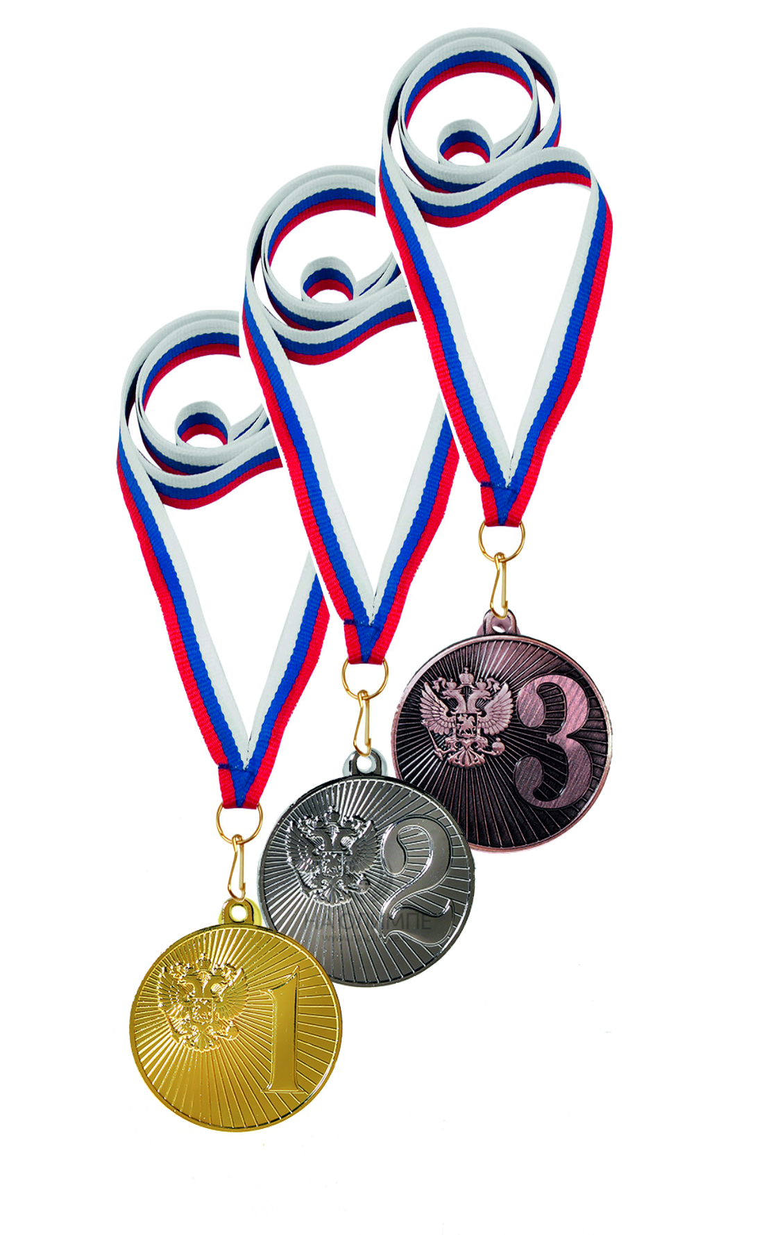 Комплект медалей металлических, диаметр 4,5 см, толщина 2 мм. В комплект входит три медали золото, серебро, бронза и три ленты РФ.